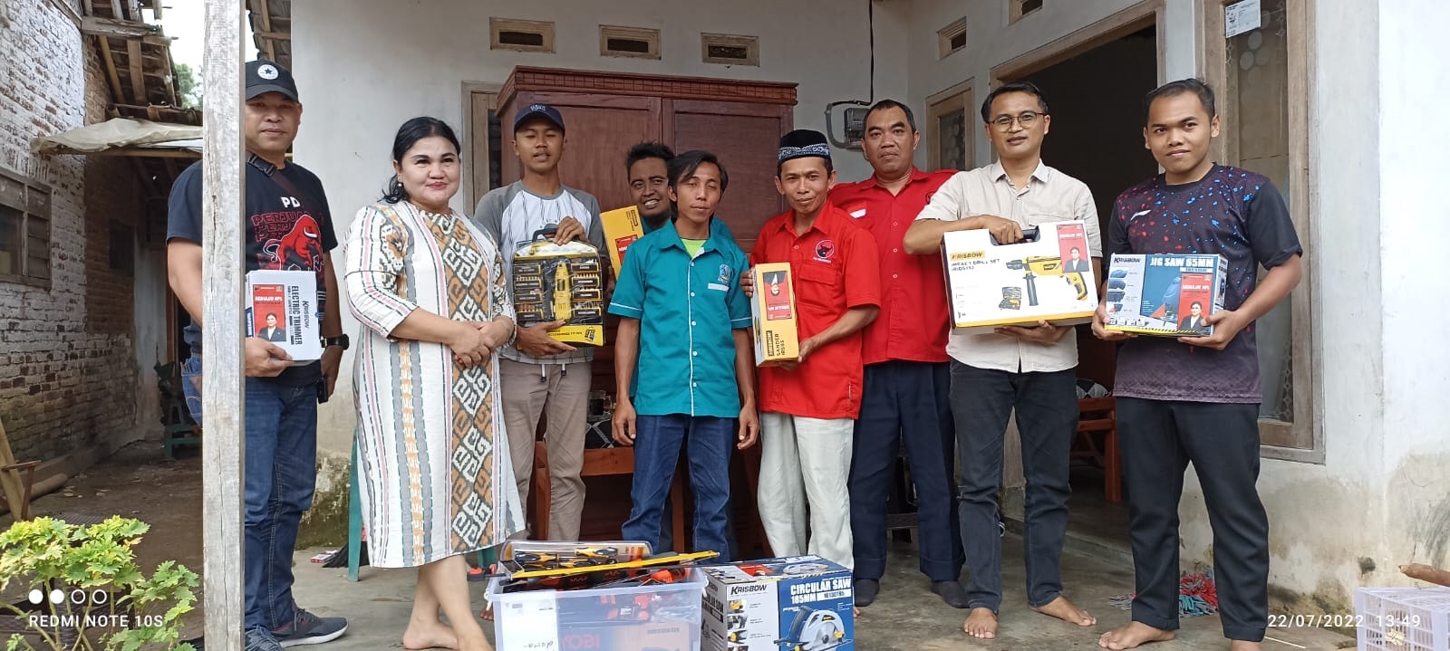 SUKORAMBI – Setelah menghadiri Pelatihan BLK, Anggota DPRD Provinsi Jawa Timur Fraksi PDI Perjuangan Hari Putri Lestari memberikan bantuan alat tukang kepada Pokmas (Kelompok Masyarakat) Al Islah di Desa Karangpring Kecamatan Sukorambi, Jumat (22/7). Kegiatan tersebut dihadiri juga oleh Pengampu dari DPC PDI Perjuangan Kecamatan Sukorambi Widarto, Ketua PAC Kecamatan Sukorambi Untung Agus, serta jajaran pengurus Ranting PDI Perjuangan Desa Karangpring.